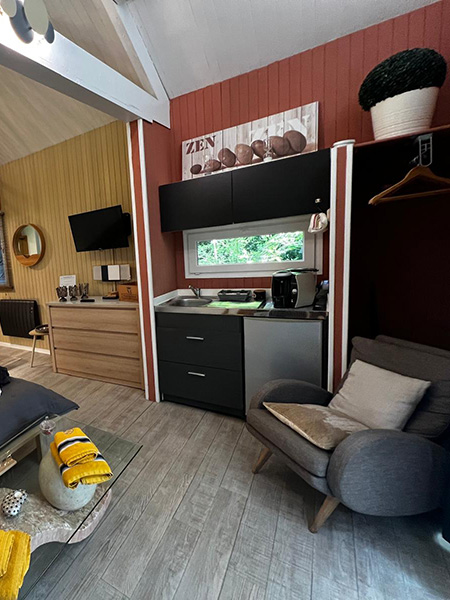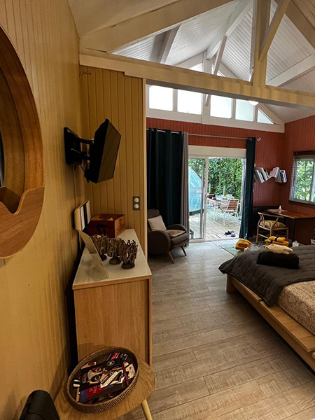 Sa terrasse privative, sans aucun vis‑à‑vis, s’ouvre sur une nature préservée et accueille un spa où l’on se ressource face à la Rhune, majestueuse sentinelle des montagnes basques. À l’intérieur, un espace lumineux et chaleureux vous attend : lit douillet, salle d’eau élégante, coin salon et équipements modernes pour un séjour sans compromis.
